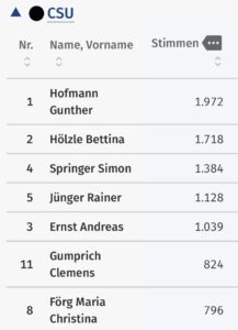 Besonders hervorzuheben ist die langjährige Erfahrung von Rainer Jünger, der sich für seine dritte Legislaturperiode bewirbt. Auch Bettina Hölzle (CSU-Fraktionsvorsitzende), Andreas Ernst und Simon Springer möchten nach einer erfolgreichen ersten Amtszeit weitermachen und streben ihre zweite Legislatur an.